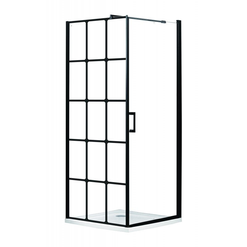 Eddy 6 mm tempered glass hinged door corner shower, black finish.