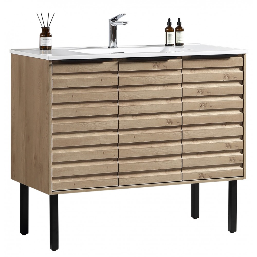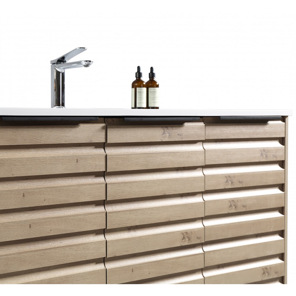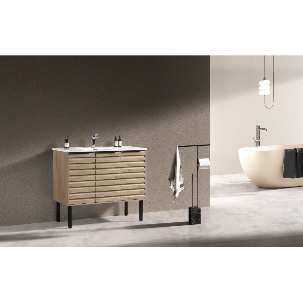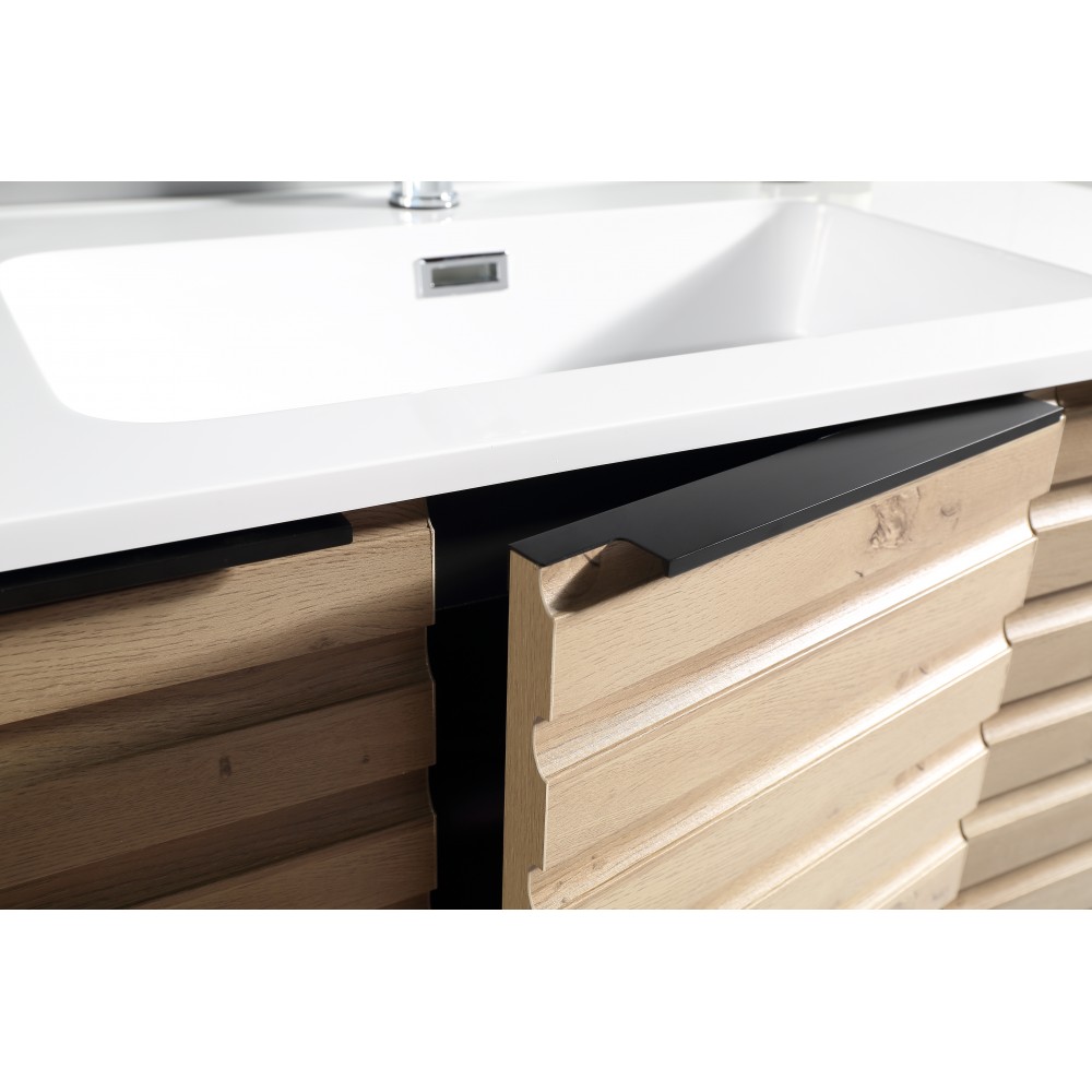 The Tavira 39.5" vanity embodies modern elegance with its horizontal fluted façade and warm Zurich Oak finish. Supported by a sleek black metal base, it blends natural texture with refined geometry for a timeless, contemporary aesthetic.