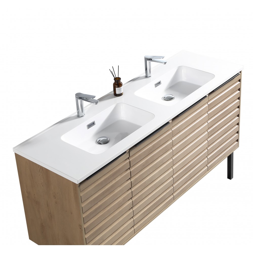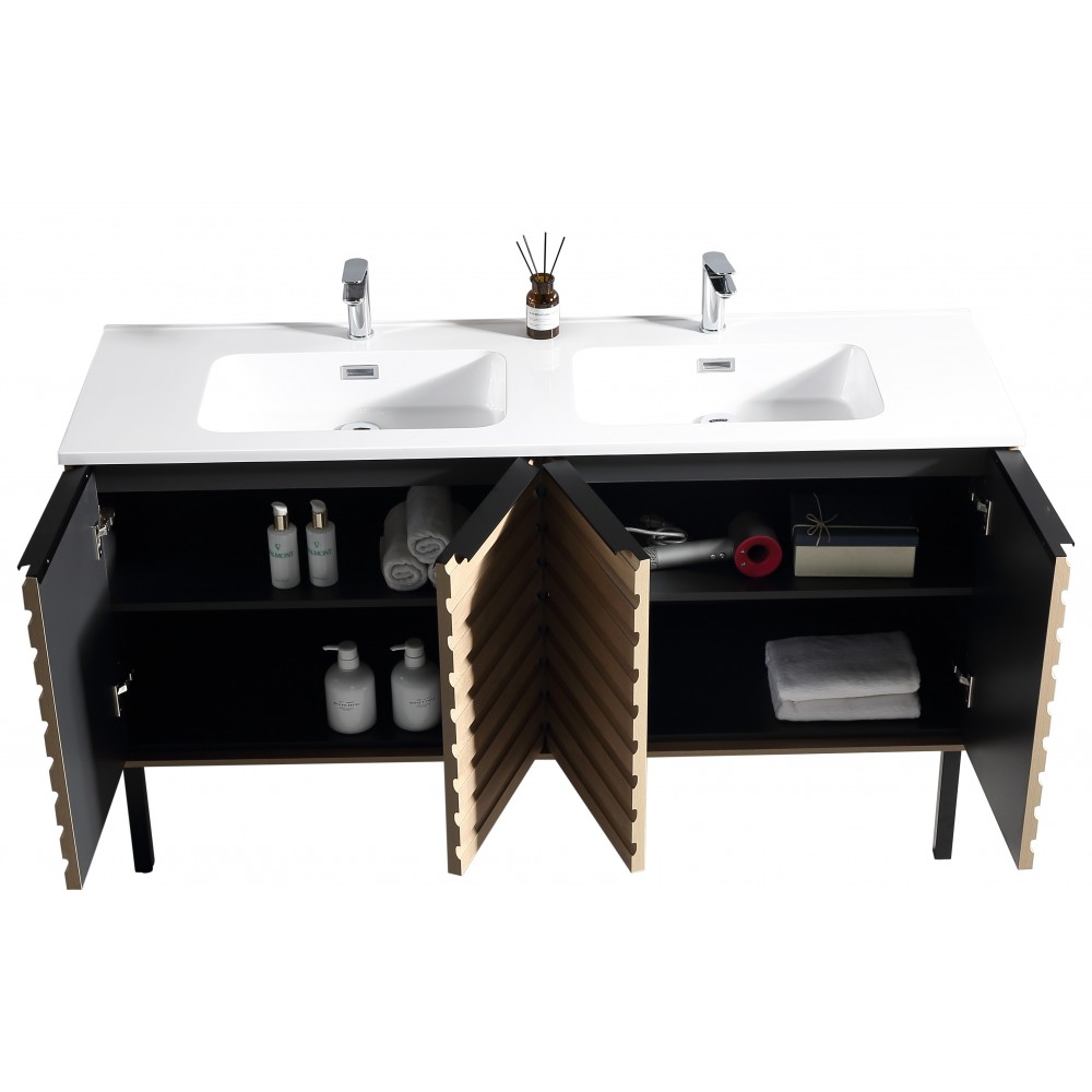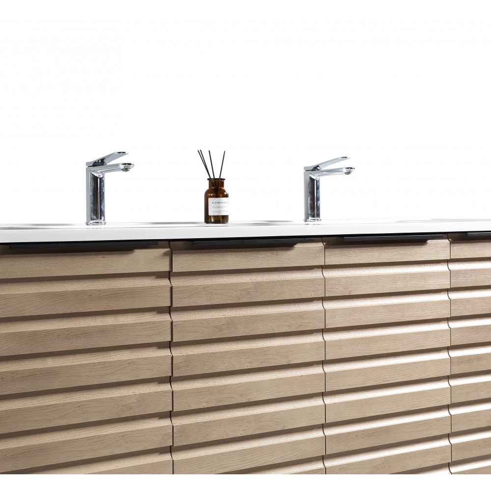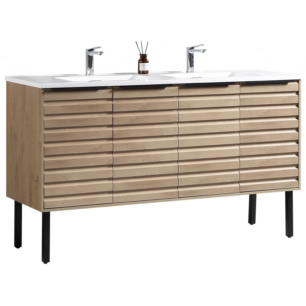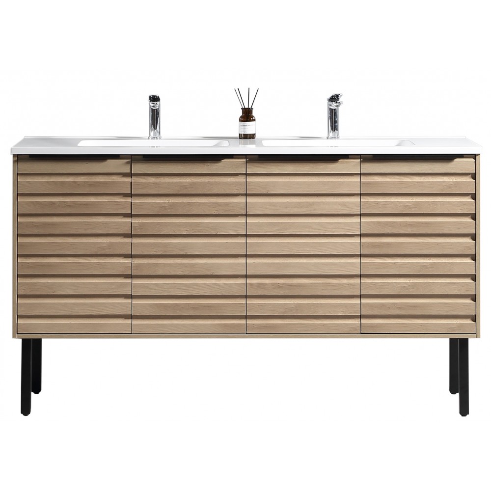 The Tavira 60" vanity embodies modern elegance with its horizontal fluted façade and warm Zurich Oak finish. Supported by a sleek black metal base, it blends natural texture with refined geometry for a timeless, contemporary aesthetic.