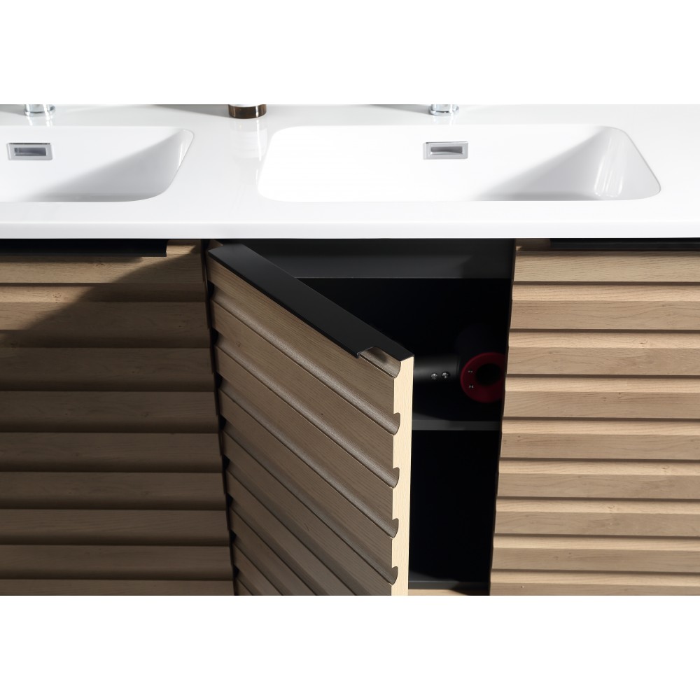 Horizontal fluted front in Zurich Oak finish for a modern, textural look.