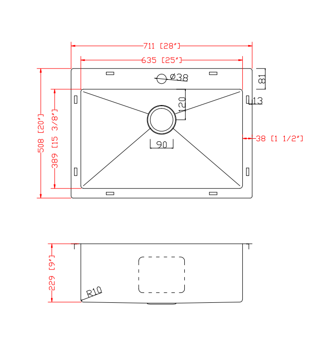 Dessin technique pour évier en acier inoxydable ID-2820-SS-T