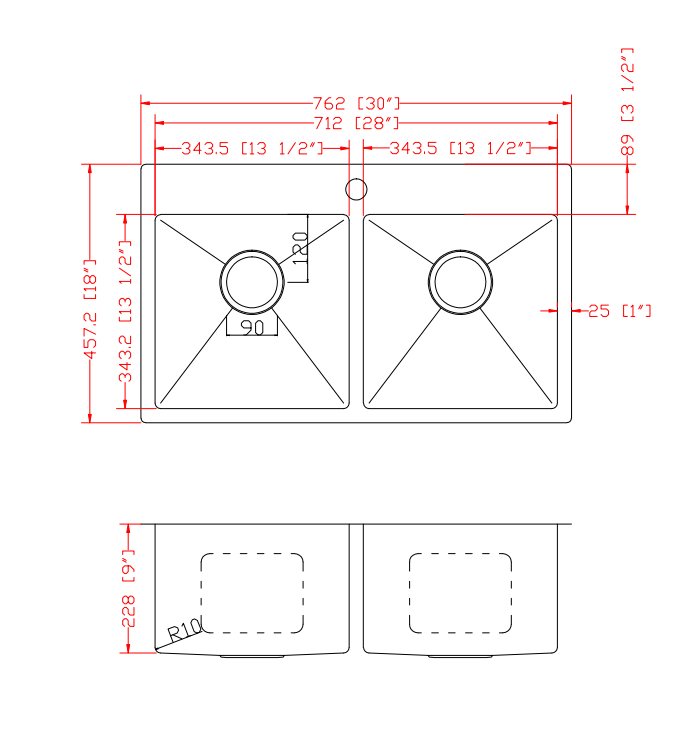 Sa configuration à double cuve décalée – avec une cuve plus grande à gauche – facilite la manipulation des grands ustensiles de cuisine tout en conservant un espace dédié au rinçage, à la préparation ou au nettoyage. Les angles arrondis (rayon R10) lui confèrent une allure moderne et épurée, tout en facilitant son entretien.